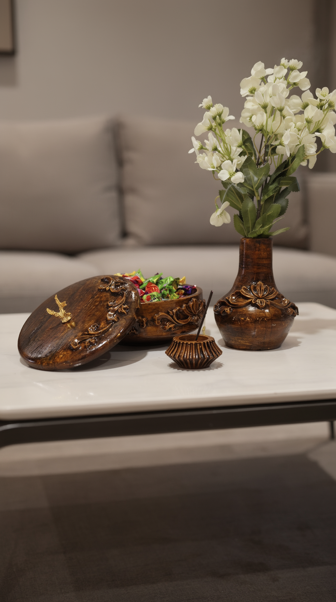 ست جا شکلاتی درب دار پایه و دستگیره طلایی/ گلدان/ جا عودی سنگی با تنوع رنگی