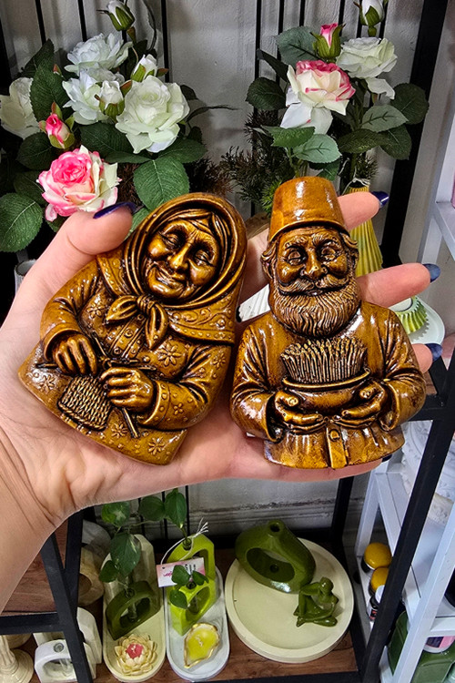 استند آیینه/ ۳ عدد جاشمعی/ ۶ عدد کاسه/ ۱ عدد کاسه سبزه/ تندیس پدربزرگ مادربزرگ/گلدان/ساعت با سه عقربه